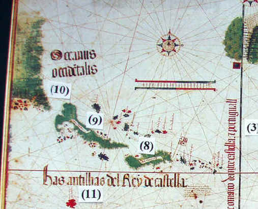 Look for yourself, here. (9) is Cuba and (8) is Hispaniola. If the Caymans are there, they are awful small. What you see below (9) is Jamaica, a known island at the time.